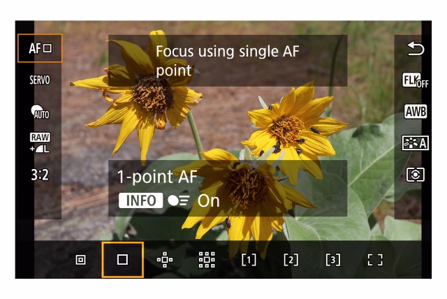 EOS R50 V menawarkan beberapa area autofocus, mulai dari titik tunggal hingga seluruh area. Titik fokus bisa dipindahkan lewat layar sentuh, atau menggunakan controller empat arah setelah tombol khusus diaktifkan.