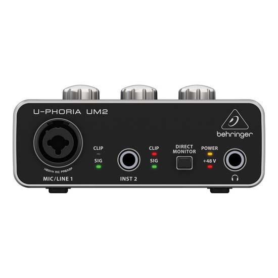 Behringer UM2 2×2 USB Audio Interface mampu melacak audio Anda dengan kecepatan pengambilan sampel hingga 48 kHz. UM2 single XENYX combination XLR/TRS microphone preamplifier dengan selectable 48V phantom power. Selain itu, UM2 memiliki front-panel 1/4″ instrument input dengan dedicated level control. Output disediakan dalam bentuk output RCA stereo dan front-panel 1/4″ headphone jack.