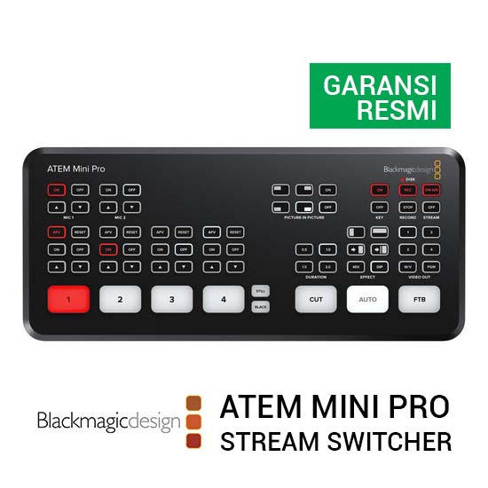 Blackmagic Design ATEM Mini Pro dengan empat input live production switcher, panel kontrol terintegrasi yang dirancang untuk streaming langsung multikamera hingga video HD ke internet atau menyiarkan aplikasi dari konsol game, komputer perusahaan streaming, atau kamera HD. Bersamaan dengan software control update, Mini Pro dibangun di atas Mini dengan fitur-fitur seperti kecepatan data streaming langsung dan informasi status, built-in hardware encoder, perekaman simultan ke drive USB, hot swapping drive dengan Blackmagic MultiDock, added record dan tombol streaming, streaming caching, timecode generator, program preview multiview, tally support, dan dukungan untuk Blackmagic Design Pocket Cinema Camera 6K dan 4K untuk digunakan sebagai sumber broadcast Anda.