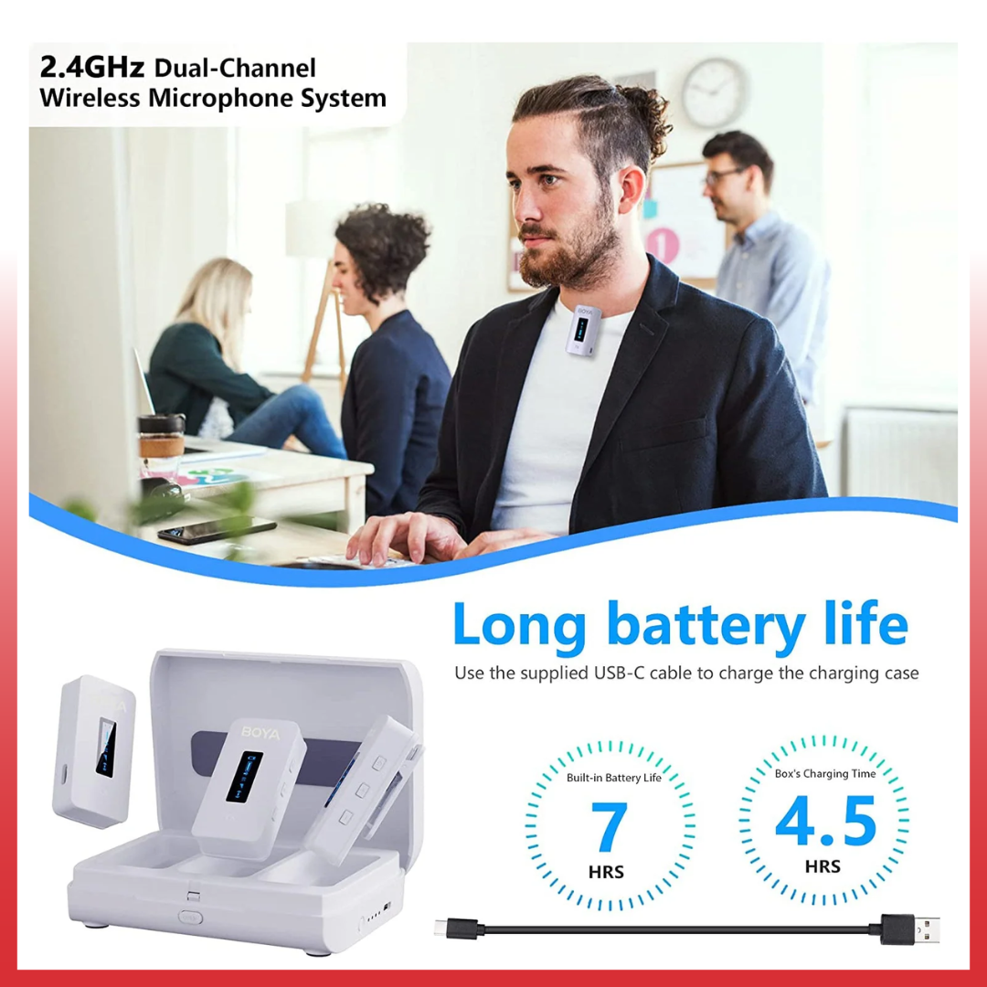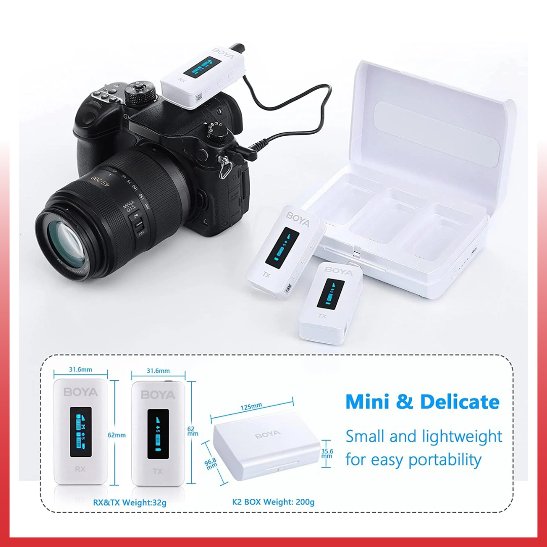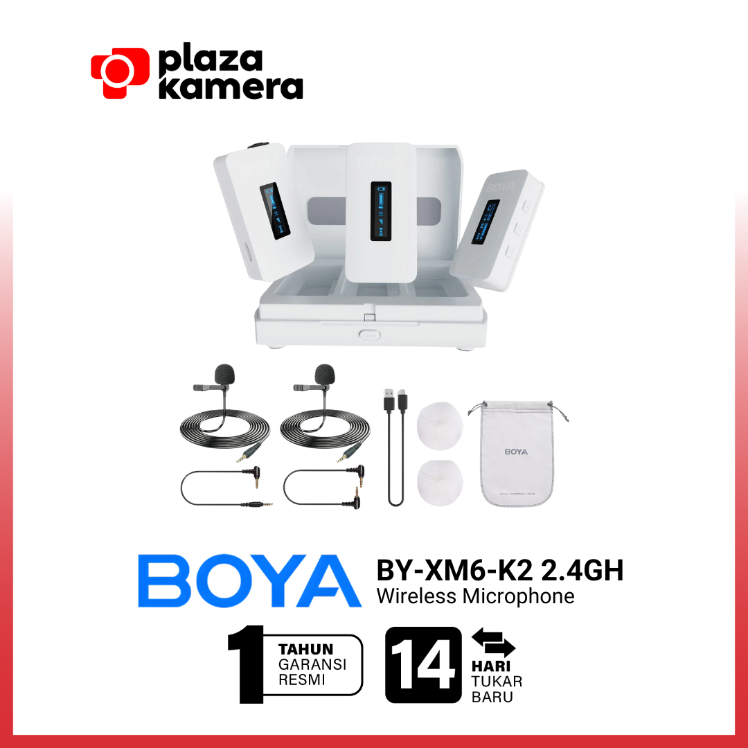 Boya BY-XM6 K2W Colorful ini mencakup dua pemancar clip-on dengan mikrofon omnidirectional built-in dan receiver dual-channel dengan konektivitas TRS 3,5mm. Layar OLED pada setiap komponen memungkinkan Anda untuk mengamati masa pakai baterai dan kekuatan sinyal sambil menyesuaikan parameter seperti penguatan dan mute. Sistem ini juga mencakup dua mikrofon omnidirectional, kaca depan berbulu dan busa, kabel TRS 3.5mm, kabel TRS ke TRRS 3.5mm, kabel pengisian daya USB-C, dan wadah pengisian daya untuk mengisi ulang semua komponen.
