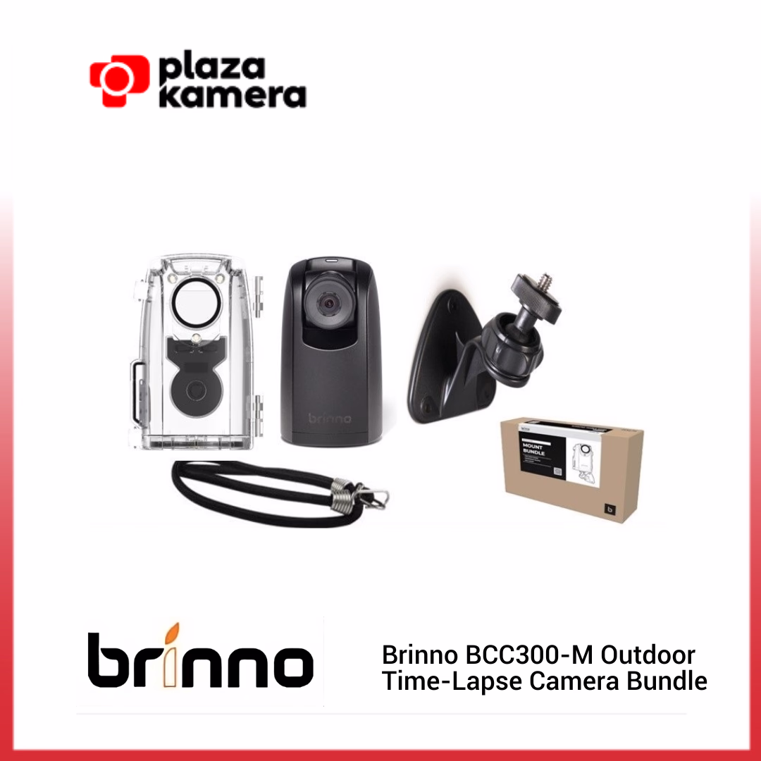 he Brinno BCC300-M Outdoor Time-Lapse Camera Bundle includes a TLC300 time-lapse camera, an ATH120 waterproof housing, an AWM100 wall mount, and two bungee cords for a time-lapse video recording solution.