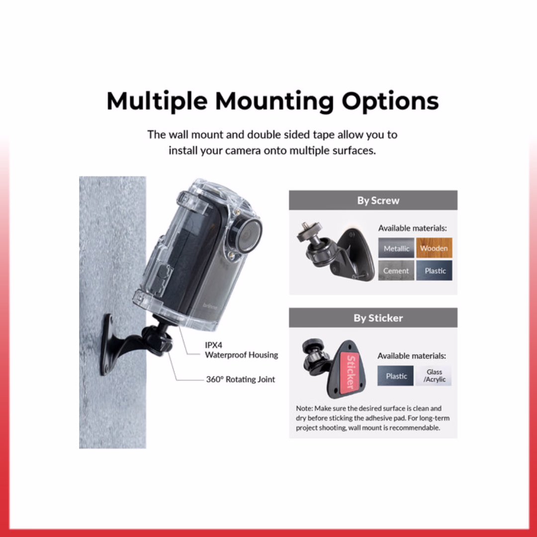The Wall Mount for Time Lapse Cameras from Brinno provides a mounting option for their time lapse cameras with or without their weather-resistant housings. The mount’s screw attaches to the camera’s standard tripod socket, and is connected to a ball joint permitting you to tilt the camera forward. The mount itself can be fixed to the wall via either a screw or an adhesive pad.