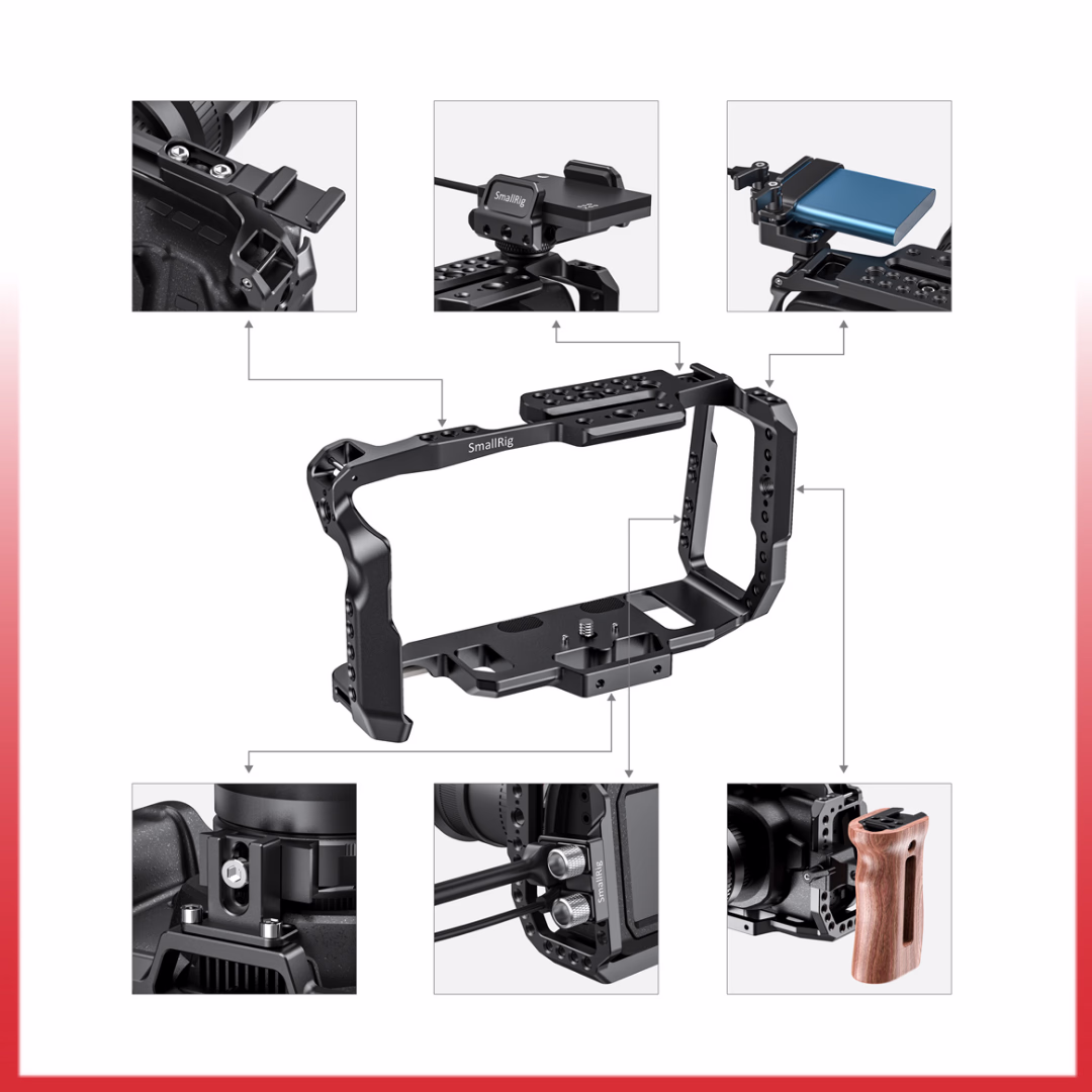 Crafted from high-quality aluminum alloy, the cage offers excellent durability without adding excessive weight. Its form-fitting design securely locks the camera in place, preventing unwanted movement during handheld shooting or when mounted on tripods, sliders, or gimbals. All camera controls, ports, battery compartment, and screen remain fully accessible while the cage is installed.