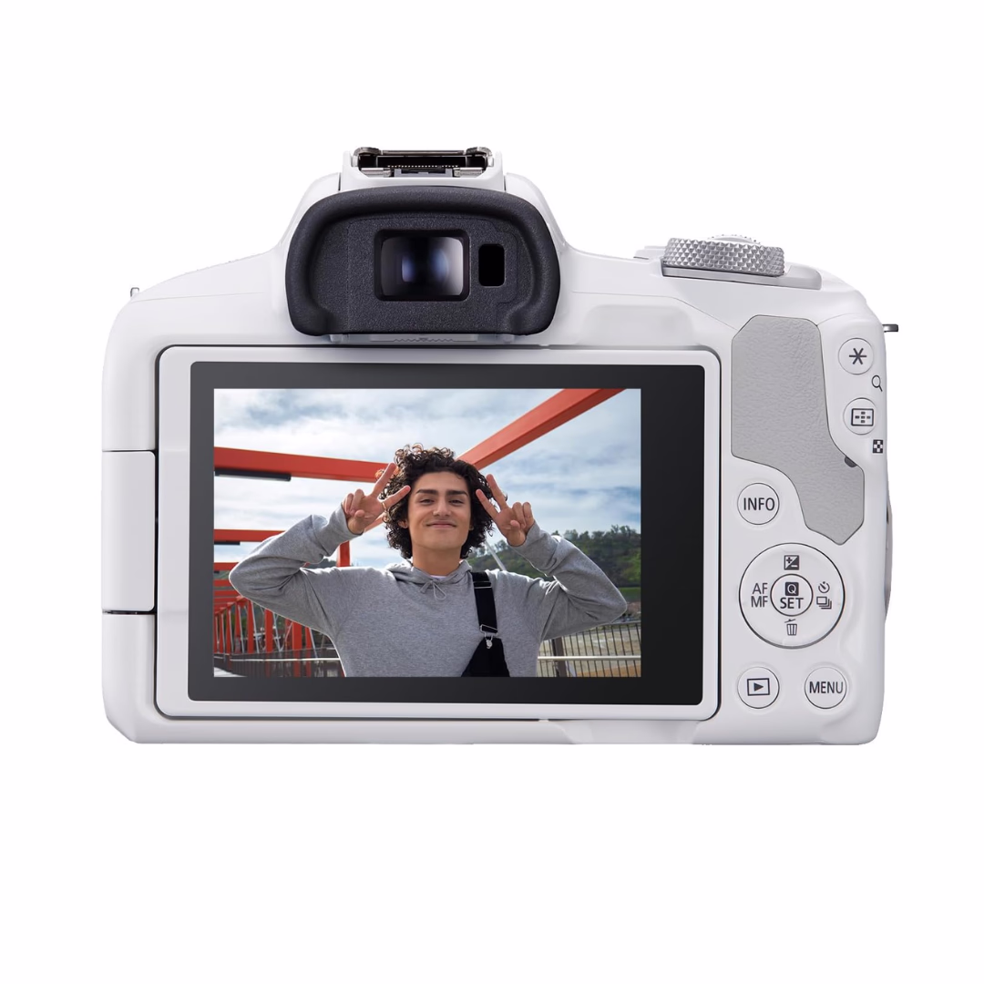 Canon EOS R50 Body Only White adalah kamera mirrorless yang sangat serbaguna dengan serangkaian fitur foto dan video yang canggih. Ditujukan bagi para pembuat konten dan vlogger, kamera ini sedikit lebih kecil dan lebih ringan daripada EOS M50 Mark II dan dilengkapi dengan sensor CMOS APS-C 24,2MP yang telah ditingkatkan dan prosesor gambar DIGIC X untuk menghasilkan foto beresolusi tinggi dan video UHD 4K.