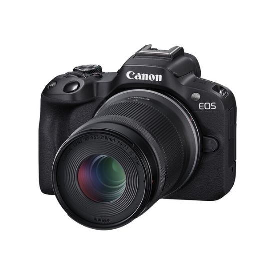 Canon EOS R50 Kit RF-S 18-45 STM + RF-S 55-210 STM memasangkan kamera mirrorless multimedia hitam dengan lensa zoom standar RF-S 18-45mm f/4.5-6.3 IS STM dan lensa zoom telefoto RF-S 55-210mm f/5-7.1 IS STM.