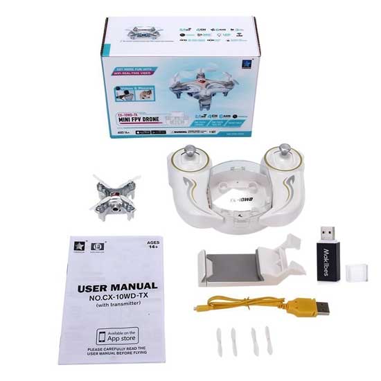 Selain itu drone mini ini juga dilengkapi One key taking off/landing function yang membuat operasi menjadi lebih nyaman dan mudah. Cheerson CX-10WD-TX begitu compact dan portable dengan Diameter Blade: 30mm / 1.18in, Dimensi: 4.2cm * 4.2 * 2.5cm / 1,65 * 1,65 * 0.98in.