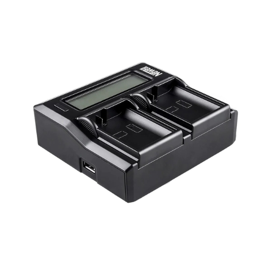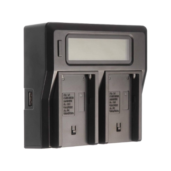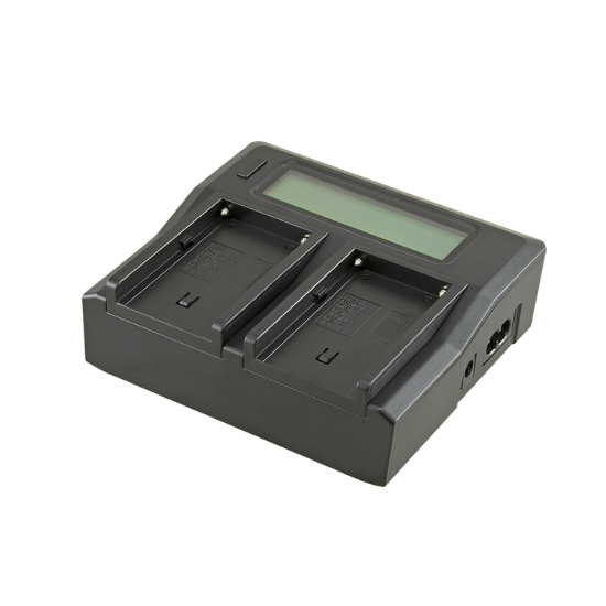 Dual Battery Charger with LCD for Sony NP-F yang menunjukkan status pengisian daya baterai, pengisi daya ini menyediakan 1,5A ketika satu baterai berada di dalam pengisi daya dan 0,8A per baterai ketika dua baterai mengisi daya secara bersamaan. Fungsi pra-pengisian daya membantu memperpanjang masa pakai baterai. Juga dilengkapi dengan output USB yang menyediakan 5V, 2100mA ke smartphone atau perangkat kecil saat pengisi daya dicolokkan ke sumber AC. Kabel daya AC dinding disertakan dalam paket.