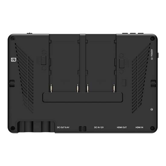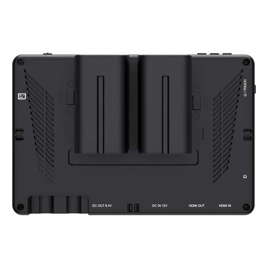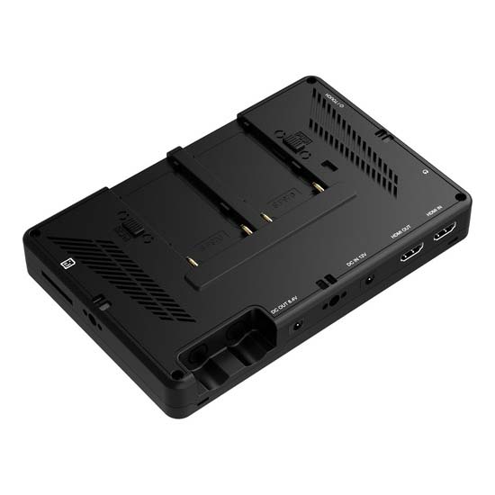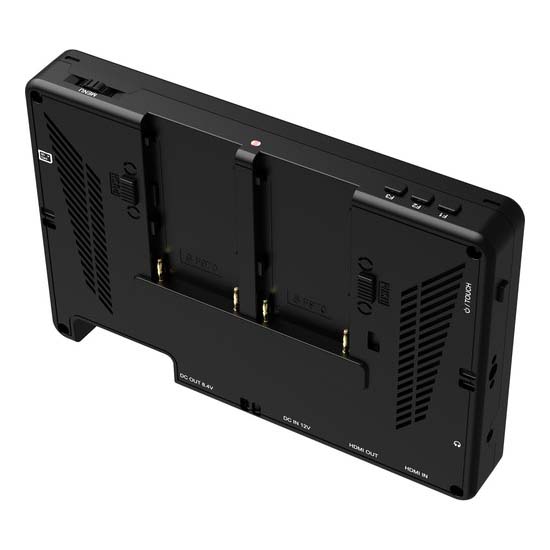 Di sisi monitor Anda akan menemukan konektor input dan output HDMI, dan di sisi lain ada output headphone 3.5mm, input daya 12 VDC 2.1mm barel (dengan adaptor daya opsional), dan 8.4 VDC 2.1mm output daya barel untuk memberi daya pada aksesoris opsional atau kamera Anda menggunakan kabel atau dummy baterai yang tersedia secara terpisah. Di sepanjang tepi bawah ada ulir pemasangan 1/4″-20, dan tombol kontrol berada di sepanjang tepi atas monitor. Bagian belakang monitor dilengkapi pelat baterai L-series/NP-F ganda untuk menyediakan daya yang cukup.