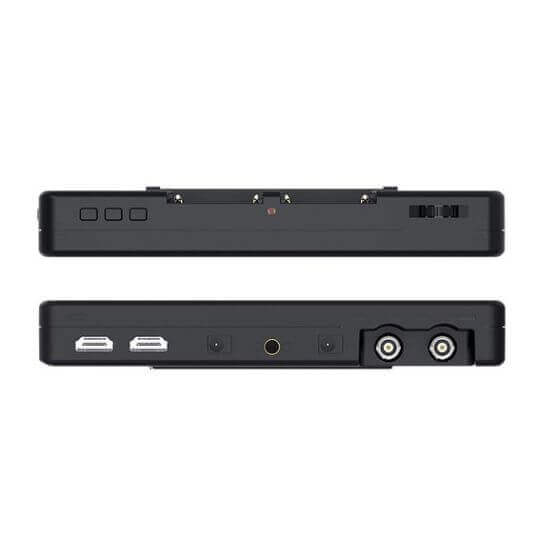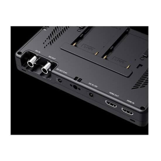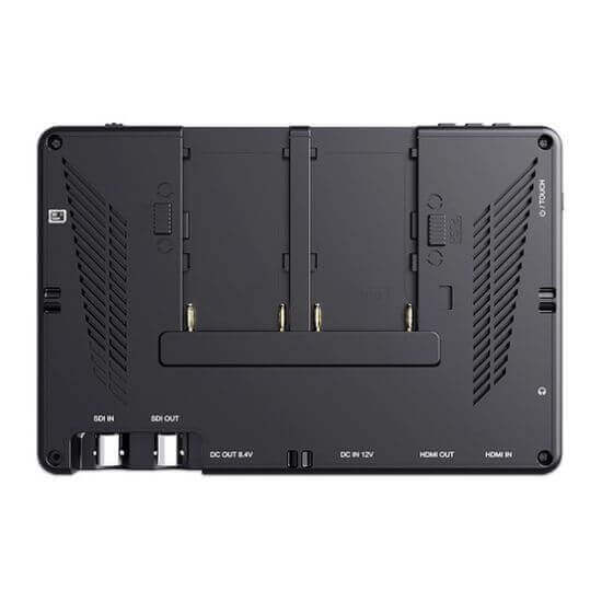 Di sisi monitor, Anda akan menemukan konektor input dan output HDMI dan SDI, dan di sisi lain terdapat output headphone 3,5 mm, input daya barel 12 VDC 2,1 mm (dengan adaptor daya opsional), dan output daya barel 8,4 VDC 2,1 mm untuk memberi daya pada aksesori opsional atau kamera Anda menggunakan kabel yang tersedia secara terpisah atau baterai dummy. Di sepanjang tepi bawah terdapat ulir pemasangan 1/4”-20, dan tombol kontrol berada di sepanjang tepi atas monitor. Bagian belakang monitor dilengkapi pelat baterai L-series/NP-F ganda untuk memberikan daya yang cukup.