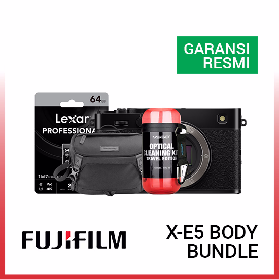 FujiFilm X-E5 Body Only Black Bundle menghadirkan teknologi pencitraan canggih dalam desain bergaya analog. Dibuat untuk para kreator yang menginginkan pengalaman pengoperasian kamera lebih tactile, X-E5 dilengkapi dengan lima-axis IBIS, auto focus berbasis AI, foto 14-bit Raw, dan video 6.2K 29.97 fps. Di antara banyak kontrol fisik yang ada, terdapat dial khusus film simulation yang memudahkan navigasi cepat antara preset bawaan FUJIFILM dan tiga pengaturan kustom yang bisa disesuaikan pengguna.