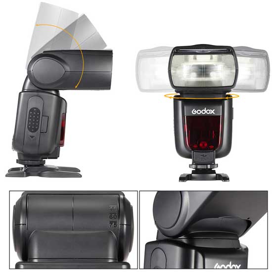 - Swinging / tilting flash head (bounce flash): 0° to 360° horizontal dan -7° to 90° vertical