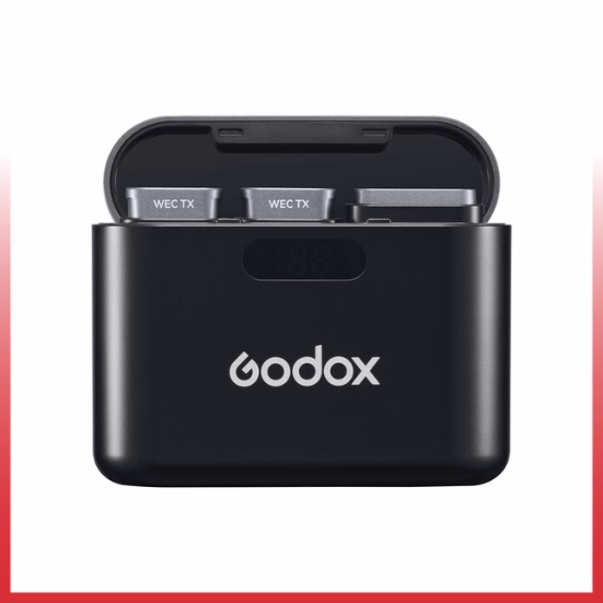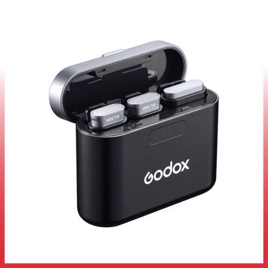 Godox WEC 2 Kit Wireless Microphone ini dilengkapi dengan dua clip-on transmitter yang sudah memiliki mikrofon bawaan, serta dual-channel receiver dengan konektor 3.5mm TRS. Cukup pasangkan transmitter pada kerah pakaian pengguna, lalu pasang receiver di cold shoe mount kamera menggunakan belt clip bawaan.