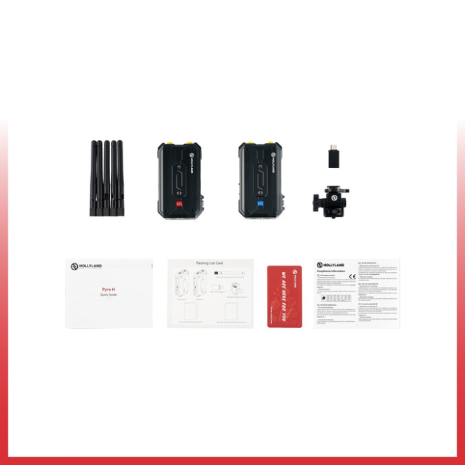 Hollyland Pyro H Wireless Video Transmission mencakup pengirim nirkabel, penerima nirkabel, lima antena, adapter USB-A ke USB-C, dan mount adapter sepatu yang dapat disesuaikan. Pengirim menyediakan input HDMI dan memiliki latency sangat rendah sebesar 60 ms yang menerima transmisi garis pandang dari jarak hingga 1300 kaki ke penerima yang disertakan. Saat menggunakan mode siaran dengan hingga empat penerima dan dua perangkat seluler, sistem mendukung jarak hingga 650 kaki. Penerima mengeluarkan ke HDMI, dan pengirim juga dilengkapi dengan output loop HDMI untuk menampilkan feed lokal Anda pada monitor.