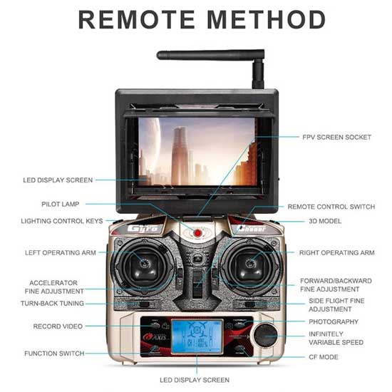 Selain aerial fotografi dan tampilan real-time, drone juga dilengkapi dengan fitur 6-axis gyro, drone ini mampu melakukan aksi yang sulit seperti rolling 360º. Kontroler juga dilengkapi full scale yang menawarkan tombol switch bebas antara mode 1 dan mode 2, sehingga lebih baik dikendalikan sekaligus untuk memberikan kontrol jarak jauh hingga 200 meter.