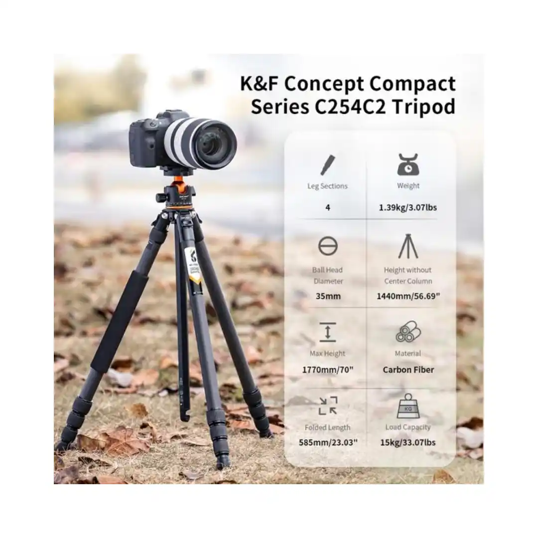 K&F Tripod SA254C2 adalah tripod carbon fiber profesional yang dirancang untuk memberikan stabilitas tinggi dengan bobot yang ringan. Produk ini sangat cocok untuk fotografer dan videografer yang membutuhkan tripod kuat namun tetap mudah dibawa.