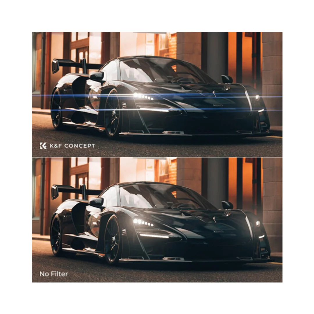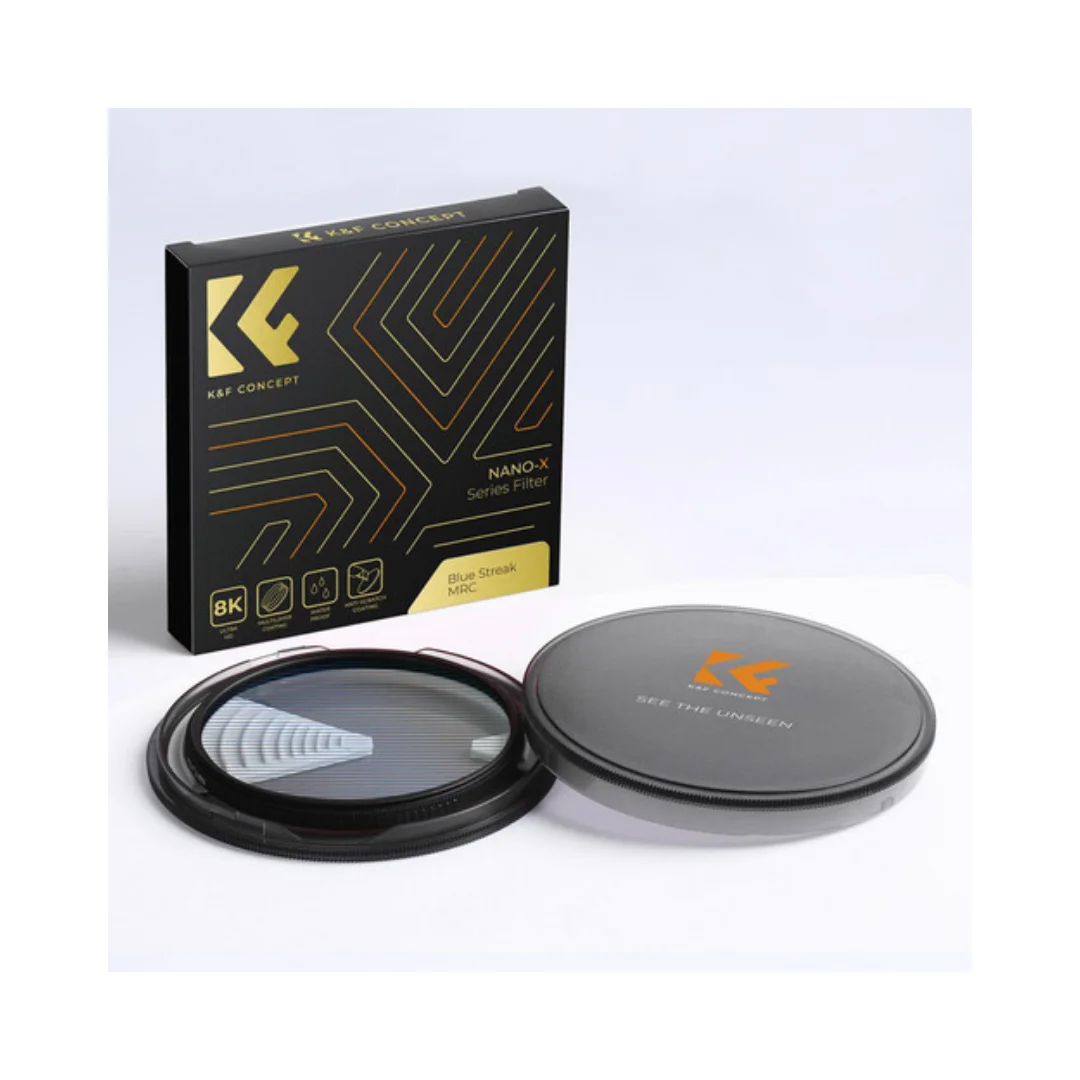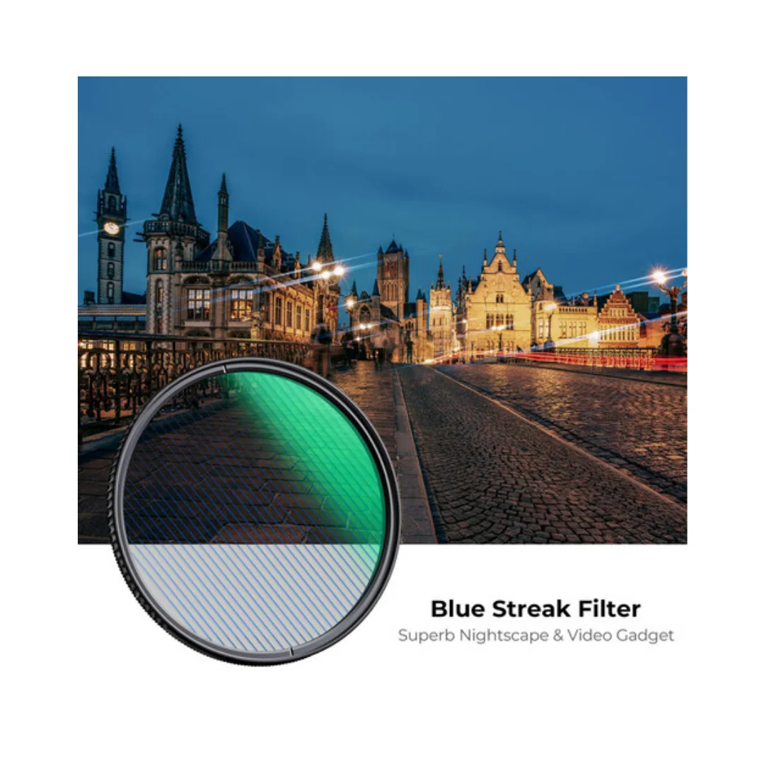K&F Concept Nano-X Series Blue Streak Filter adalah filter lensa yang dirancang untuk menciptakan efek cinematic berupa garis cahaya berwarna biru (blue streak) pada sumber cahaya terang. Efek ini sering digunakan dalam produksi film untuk memberikan tampilan dramatis dan profesional, terutama pada adegan malam hari atau dengan banyak lampu.