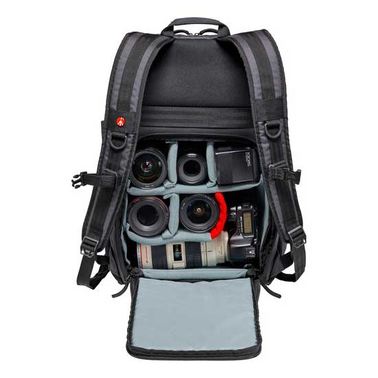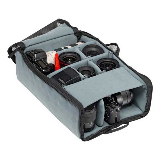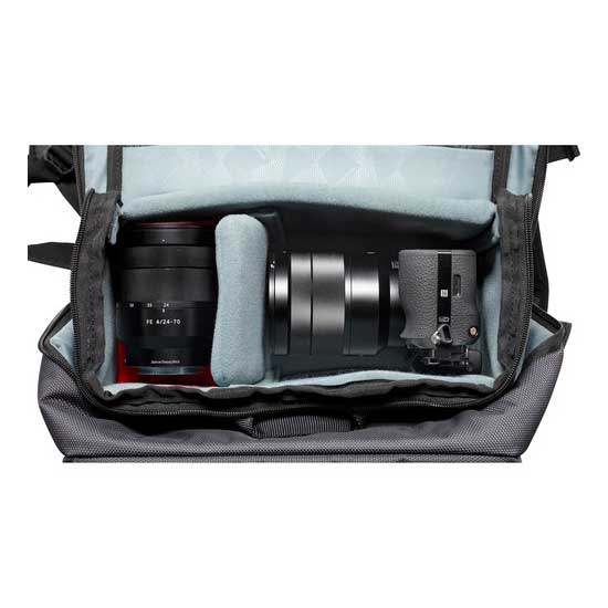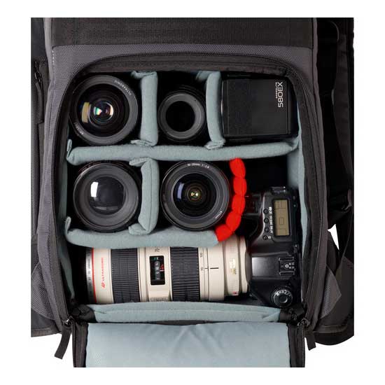 Tas ini juga memiliki akses atas dan belakang dengan sisipan empuk yang dapat dilepas dengan partisi yang memiliki pengorganisasian kamera mirrorless dengan lensa 70-200mm f/2.8 yang terpasang, empat lensa tambahan, flash dan aksesori lainnya. Selain itu, Tas juga dapat menampung laptop ukuran 15,6 ” dan tablet iPad Pro ukuran 9.7″. Anda juga dapat menempatkan Botol air dan berbagai macam aksesoris lainnya yang dapat disimpan di dalam kantong depan dan samping.