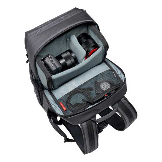 • Bagian atas dapat menyimpan kamera mirrorless seperti Sony a7 atau Fujifilm XT Series) dengan lensa zoom standar terpasang dan satu lensa tambahan