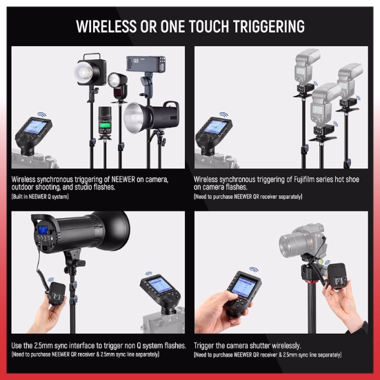 - QPRO-S dapat memicu secara nirkabel semua flash Neewer yang sudah memiliki sistem Q bawaan. Kompatibel dengan model Q3, Q4, Z1-S, NW420-S, NW655-S, NW665-S, serta S101-300W/400W Pro.