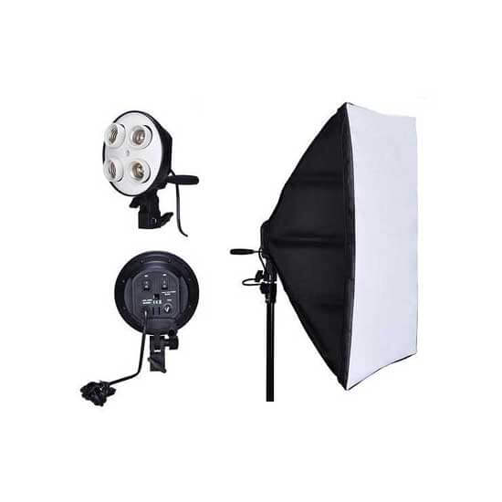 NiceFoto Socket Bulb G804C-1 With Softbox 50x70cm. Lampu menggunakan 4 bola lampu dengan ulir E27 standar dan daya hingga 45W. Panel belakang memiliki 4 sakelar untuk mengontrol masing-masing satu bohlam secara terpisah. Kit yang sangat baik untuk fotografi produk dan mode, dan untuk video. Dimensi terlipat kecil memudahkan pengangkutan kit ini. Softbox yang termasuk dalam kit dipasang langsung ke lampu. Permukaan internal kasar yang sangat baik memantulkan dan menyebarkan bola lampu. Kit ini termasuk diffuser yang dipasang di Velcro. Lampu juga memiliki soket payung. Lampu memiliki penahan sambungan, yang memungkinkan untuk menekuknya dalam kisaran +90° hingga -90°. Panel belakang juga memiliki mount untuk memudahkan pengangkutan dan pengoperasian.