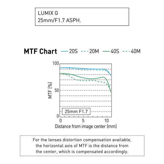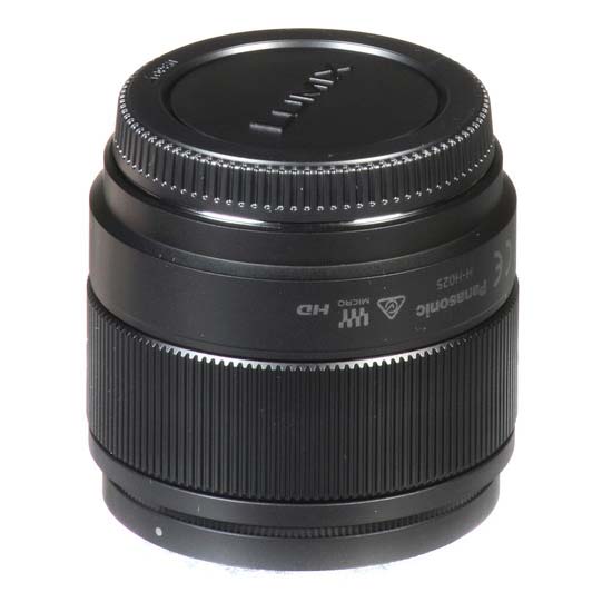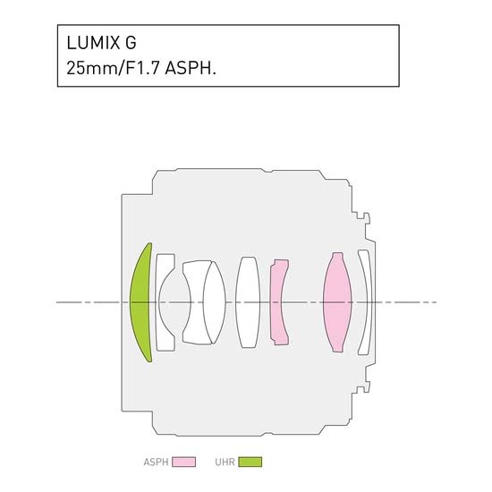 Panasonic Lumix G 25mm f/1.7 ASPH dirancang untuk kamera mirrorless Micro Four Thirds, lensa setara 50mm yang menampilkan aperture maksimum f/1.7 cerah untuk pemotretan low-light yang ditingkatkan dan kontrol depth of field. Satu UHR (Ultra-High Refractive Index) element berpasangan dengan dua aspherical element untuk mengurangi spherical aberration dan distorsi untuk ketajaman dan iluminasi ujung-ke-ujung yang konsisten. Lapisan Permukaan Nano telah diterapkan juga, dan membantu mengurangi flare dan ghosting untuk meningkatkan kontras dan ketepatan warna. Konstruksi optik juga membantu mewujudkan faktor bentuk keseluruhan yang ringkas, berukuran hanya 2″-panjang dan berat 4,4 oz. Memanfaatkan baik stills maupun pengambilan video, lensa ini juga menggabungkan stepping motor untuk kinerja fokus otomatis yang halus dan quiet yang kompatibel dengan kamera Lumix high-speed contrast-detection focusing system.