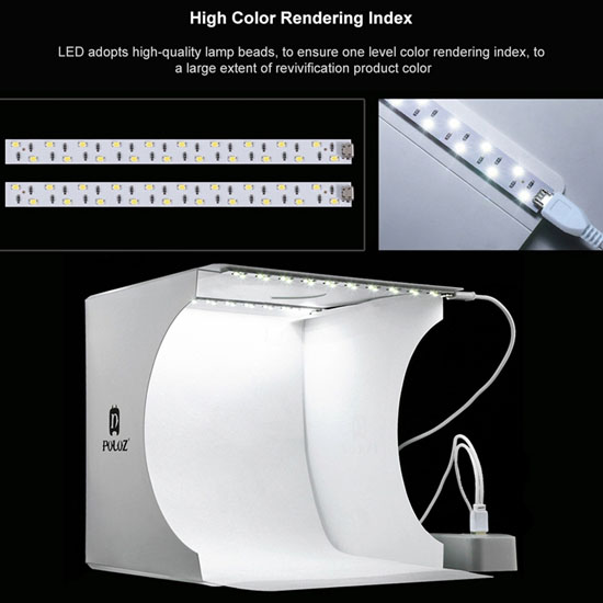 Photo Studio Mini ini dilengkapi dengan LED super terang pada box dengan total 20 titik lampu yang memberikan pencahayaan sempurna pada objek yang di foto. Photo Studio Mini ini mampu memberikan kesan yang lebih nyata pada objek dan Anda dapat menggunakan kabel USB sebagai daya untuk lampu LED-nya.