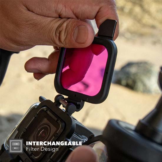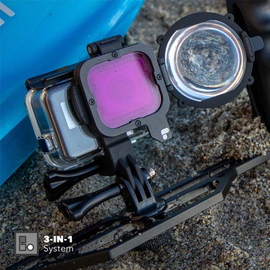 Anda dapat menggunakan filter dengan sendirinya atau bersama dengan lensa makro, Anda juga dapat menggunakan lensa makro dengan sendirinya atau dengan salah satu filter. Lensa makro memberikan pembesaran 5X. Filter merah yang disertakan paling baik digunakan di perairan tropis atau biru pada kedalaman 4.5 meter hingga 22 meter. Filter magenta yang disertakan paling baik digunakan dalam air hijau, juga pada kedalaman antara 4.5 meter dan 22 meter.