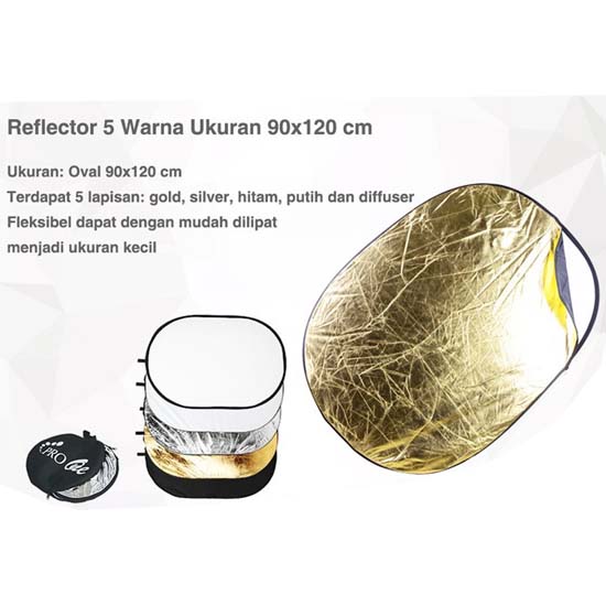 Pro One Reflector 5in1 90x120cm merupakan peralatan yang bisa dibilang wajib dimiliki bagi fotografer. Dengan Reflector, Anda bisa memberikan cahaya lebih (silver) dan warm tone (gold).