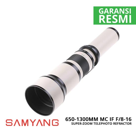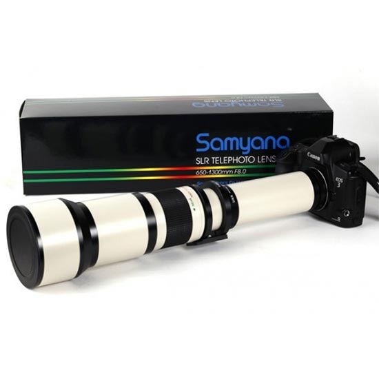 Samyang 650-1300mm MC IF f/8-16 Super-Zoom Telephoto Refractor Lensa adalah lensa zoom ultra-telephoto yang kuat yang berguna dalam situasi dimana subjek jauh harus ditarik mendekat. Dispersi rendah, lensa berlapis penuh berarti sedikit silau dan transmisi cahaya penuh untuk gambar pembentuk. Lens hood terintegrasi juga membantu menjaga cahaya yang tidak diinginkan dari foto Anda. Lensa fokus manual ini dapat fokus pada subyek sedekat 16,40 ‘(5 m). Dan perlu diperhatikan, bila digunakan pada DSLR format APS-C, kisaran fokus setara meningkat menjadi sekitar 1000-2000mm (memiliki kesamaan yang sesuai tergantung pada bodi kamera mana yang digunakannya).