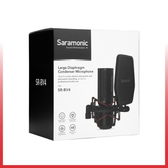 Condenser capsule pada mikrofon ini menghasilkan frequency response dari 20 Hz hingga 20 kHz, ideal untuk suara vokal yang tajam dan detail. SR-BV4 dilengkapi dengan shockmount dengan tali elastis yang membantu mengisolasi mikrofon dari getaran dan suara saat penanganan; mount ini memungkinkan penempatan yang cepat dan mudah pada stand mikrofon atau boom arm apa pun. Mikrofon ini memiliki konstruksi yang kokoh dengan bahan logam sepenuhnya dan internal pop filter dari logam-mesh. Tersedia juga external pop filter tambahan yang dapat dipasang pada shockmount untuk lebih mengurangi plosif dan suara pop pada vokal. Balanced 3-pin XLR output memungkinkan konektivitas standar dengan berbagai mic preamps, audio interfaces, dan mixers. SR-BV4 memerlukan 48V phantom power untuk beroperasi.