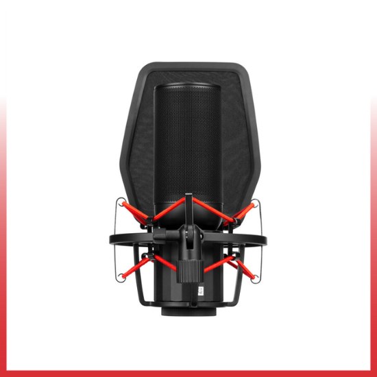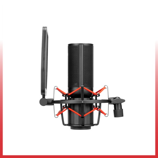 - Shockmount yang termasuk dengan tali elastis merah mengurangi noise dan kompatibel dengan stand lantai/meja atau boom arm apa pun.