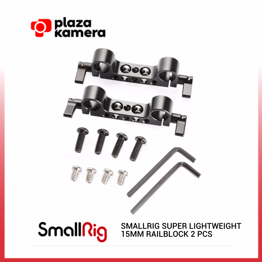 Mount a plate, cage, or other mounting gear onto 15mm LWS rods with this Lightweight 15mm Rod Block 2-pack from SmallRig. Each aluminum rod block features multiple 1/4″-20 threads for mounting on plates, accessories, or cages, and two standard LWS 15mm rod ports which are secured with two locking levers. The 2-pack comes with four long 1/4″-20 screws, four short 1/4″-20 screws, and two Allen wrenches.