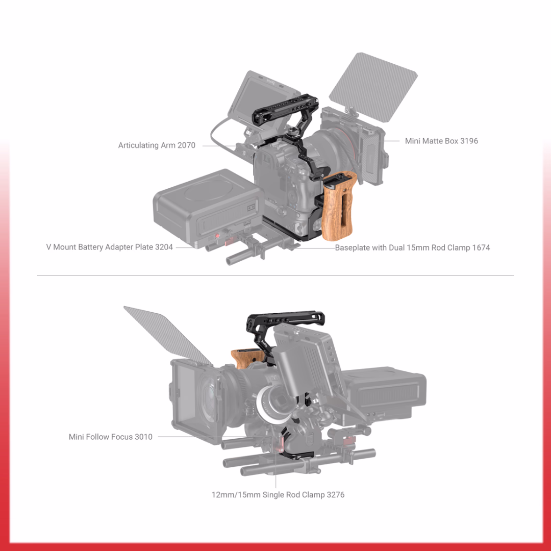 SmallRig Basic Kit for EOS R5 & R5 C &R6 with BG-R10 Battery Grip 3707 protects the camera while facilitating videoing with its multiple mounting points. Top Handle 2165C and Side Handle 2093C allow for a handheld shoot on your own. The kit as whole features multiple mounting points (ARRI 3/8″ -16 locating holes, 1/4″-20 threaded holes, 3/8″-16 threaded hole, cold shoes) that support a wide range of accessories. The cage is secured by one screw at the bottom and shoulder strap slots on both sides. The kit also comes with Cable Clamp 2981 to protect HDMI & USB-C cables against signal disconnection as a result of loose cables.
