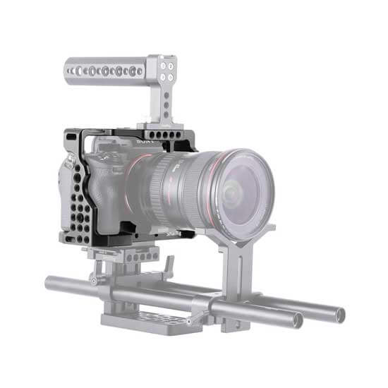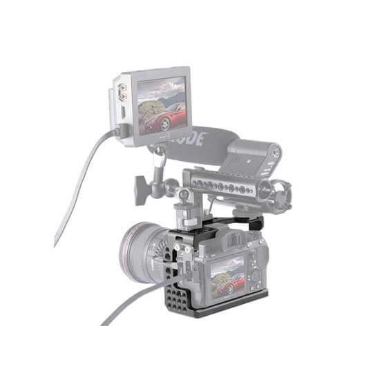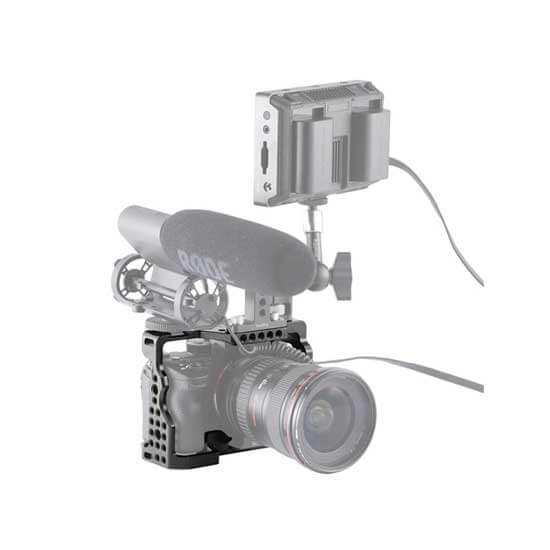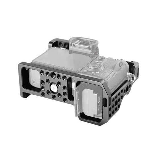 SmallRig Cage tidak memblokir akses ke semua port dan tombol, sehingga hot shoe di kamera dapat dipasang dengan Sony XLR 2KM dan XLR-K1M atau lampu flash dengan ruang yang cukup. Lubang berulir 1/4″- 20 di bagian atas dapat dipasang Top Handle 1984/1638 untuk pemotretan genggam, atau dapat dipasang dengan EVF Support 1842 untuk pemotretan yang lebih baik.