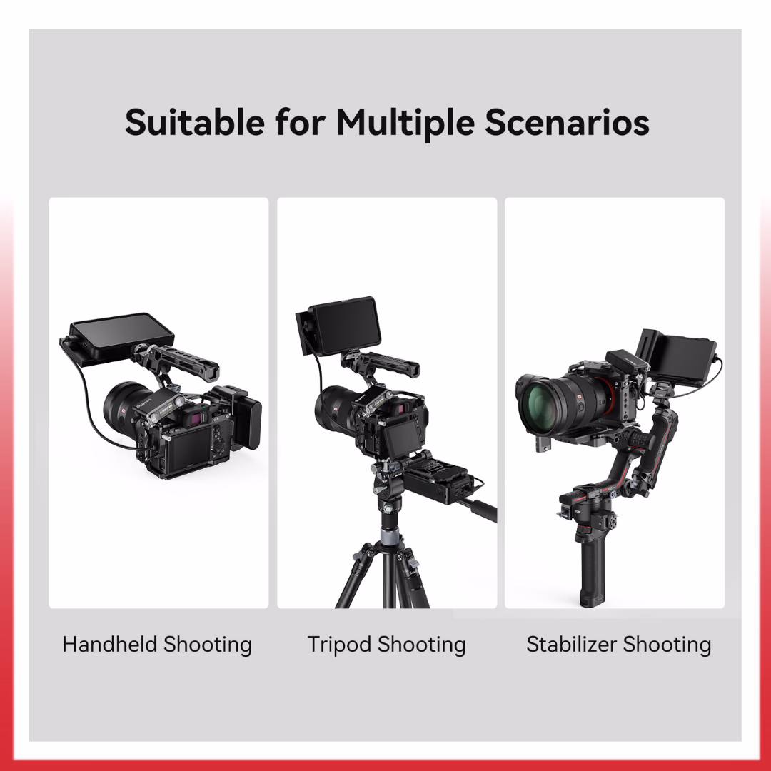The top handle gives you a firm grip on your compact rig and offers multiple cold shoe mounting options for a monitor, microphones, LED lights, or a wide array of optional NATO accessories. The HDMI cable clamp keeps your HDMI cable affixed securely with a thumbscrew and ensures uninterrupted signal transmission. Holes on both sides of the cage facilitate the usage of a separately available hand strap, and the cage includes two Allen keys for easy assembly and disassembly.