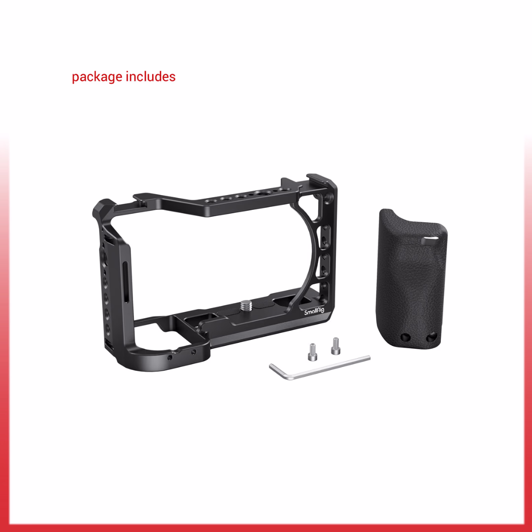 SmallRig Camera Cage with Silicone Handle for Sony A6100/A6300/A6400 3164 is designed to protect the camera and provide accessory mounting points. Features a removable silicone handle which is non-slip, anti-freeze and comfortable to grip. The cage secures to the camera via one 1/4”-20 screw and provides the secondary lock point with the shoulder strap hole on the right side to prevent twists. Featuring multiple 1/4″-20 threaded holes, ARRI 3/8″-16 locating holes for attaching the Monitor Mount 2903, Mini Top Handle 2771 or other accessories to set up a complete kit for your video productions. The top of the cage comes with two cold shoe mounts for attaching a microphone or sound receiver directly. The bottom integrates with an Arca swiss plate for quick transfer to the Arca tripod. The built-in rubber pads at the bottom protect the camera from scratching. Moreover, the cage maintains access to camera buttons, ports and the infrared receiver. The built-in flat head screwdriver stores at the bottom for quick assembly and disassembly. Optional HDMI Cable Clamp 1693 is separately available to protect the HDMI port.