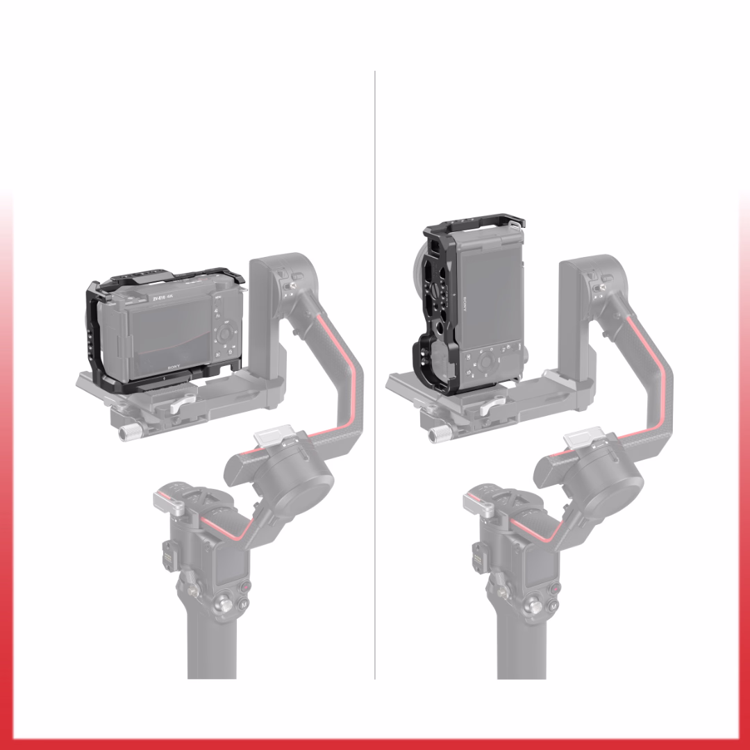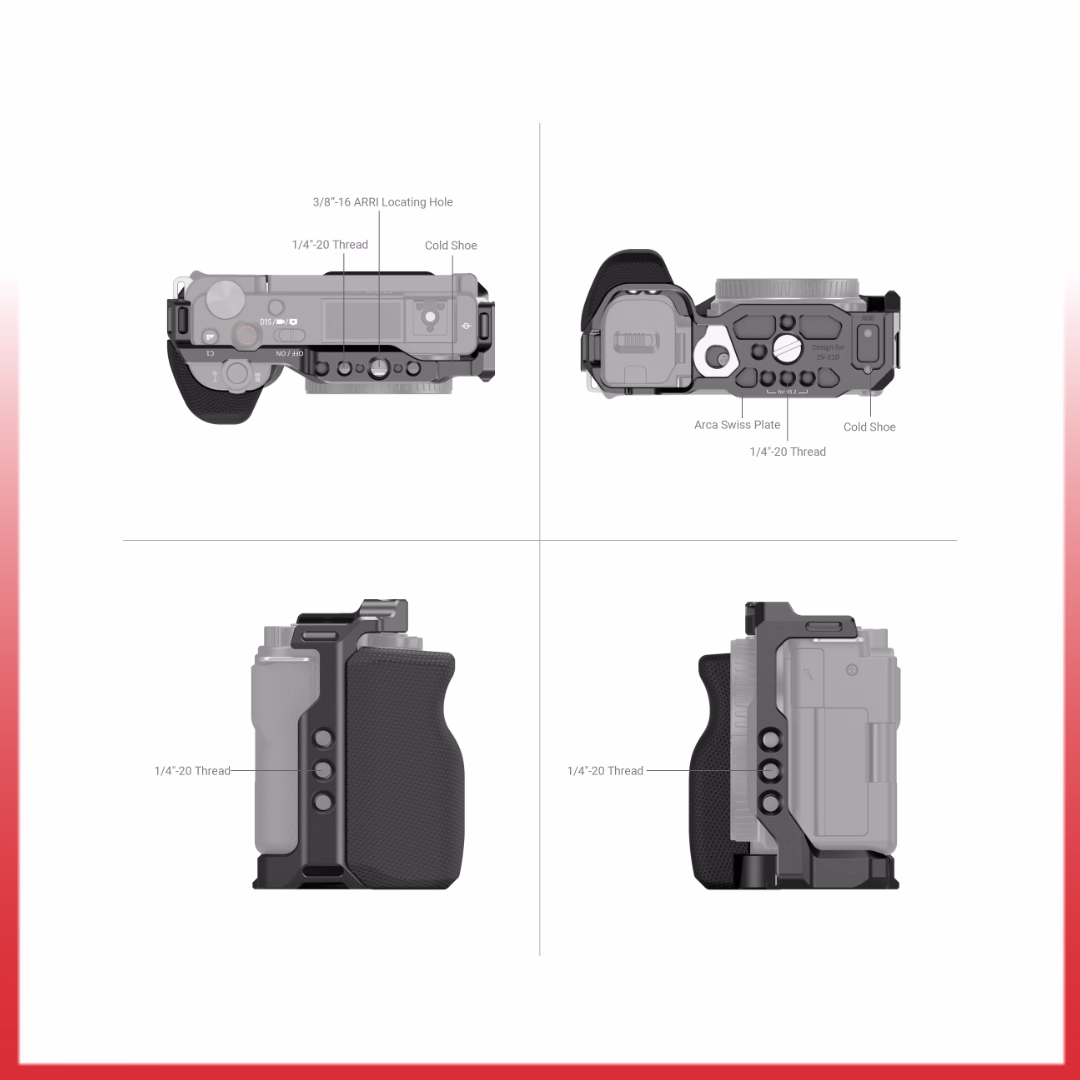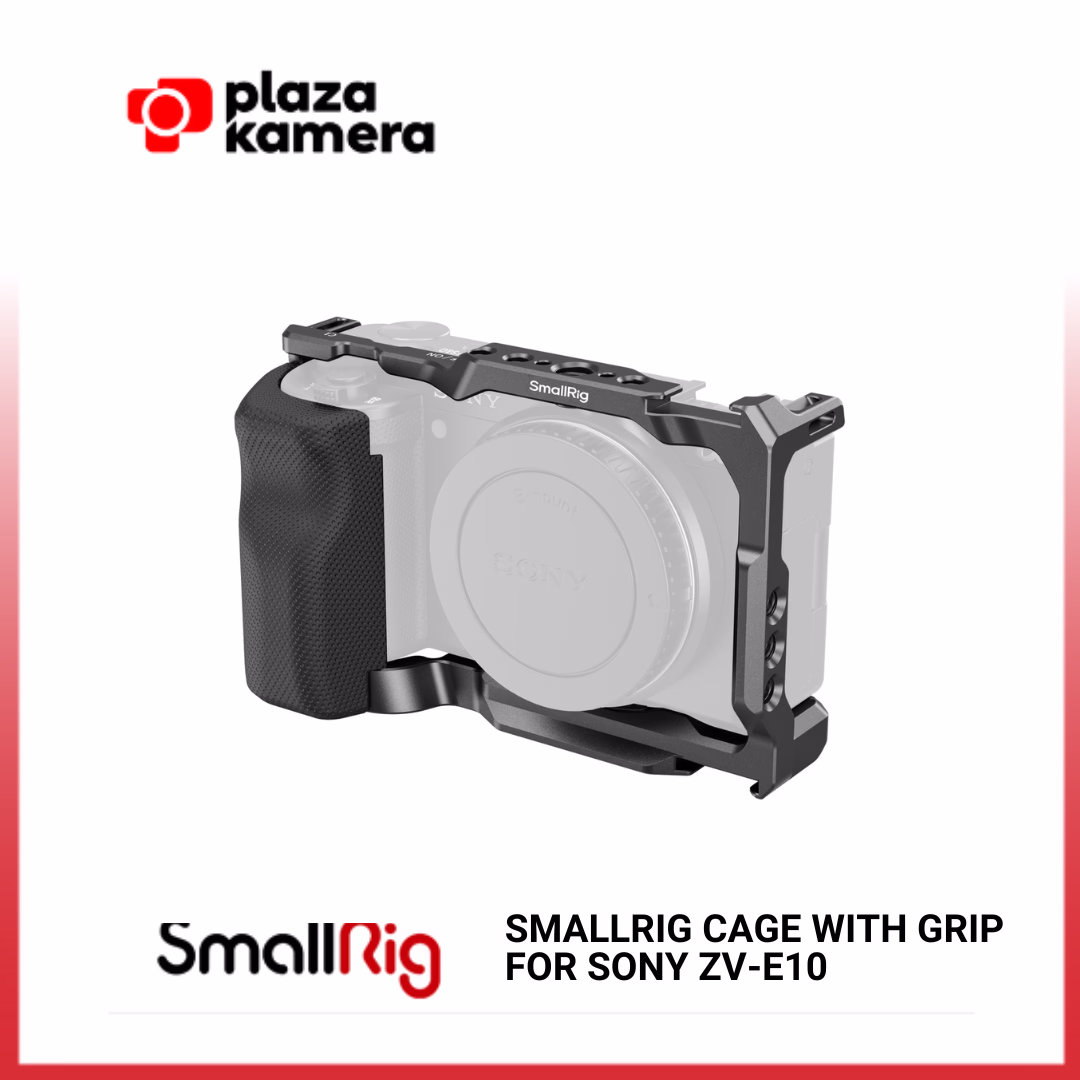 SmallRig Cage 3538B for Sony ZV-E10 adalah cage khusus untuk kamera Sony ZV-E10, memberikan perlindungan penuh, pegangan ergonomis yang nyaman (bisa dilepas), serta berbagai titik pemasangan aksesori seperti lubang 1/4″-20, 3/8″-16 (ARRI), dan cold shoe untuk vlogging atau setup profesional, sambil tetap menjaga akses ke semua tombol, baterai, dan layar kamera.