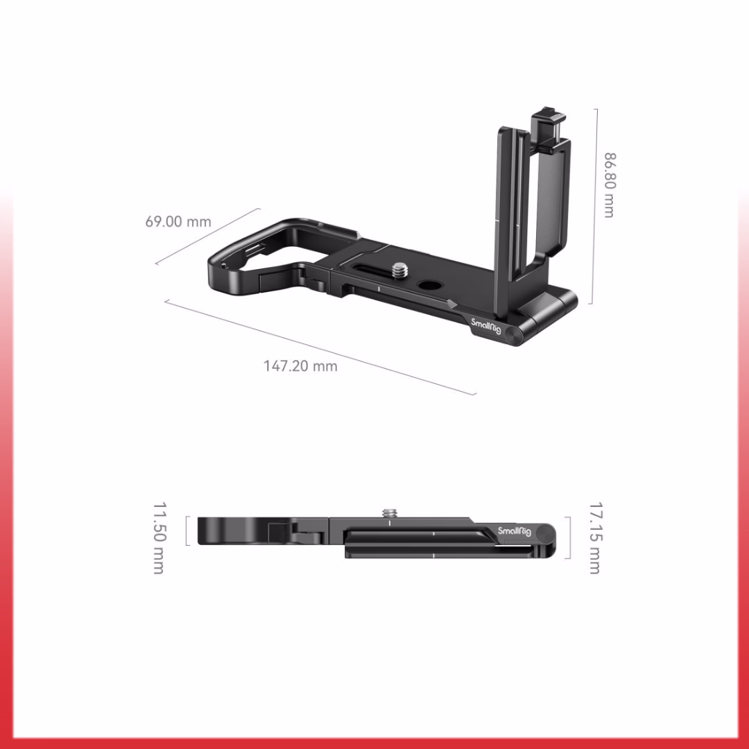 SmallRig Foldable L-Shape Mount Plate for Sony Alpha 7R V / Alpha 7 IV / Alpha 7S III 3984 facilitates quick switch between horizontal and vertical shooting while maintaining access to LCD flip screen. The Arca-Swiss side plate is quickly folded onto the bottom via a folding press button for horizontal shooting and stored as one portable piece of accessory, and the baseplate can be stretched for vertical shooting to allow cables access. Locking the camera via a 1/4″-20 screw and locating pins at the bottom, the L-bracket features cushions to prevent scratches and twisting as well as a hinge arm at the battery door that fits the camera curve and enhances the grip experience. In the baseplate, there are multiple 1/4″-20 threaded holes for Magic Arm 3873 and Cold Shoe 2935 for the monitor, microphone, and other accessories in video production, a wrist strap hole, and a QD connector for quick attachment of QD shoulder strap and wrist strap, and a slotted screwdriver available for L-bracket disassembly and stretch.