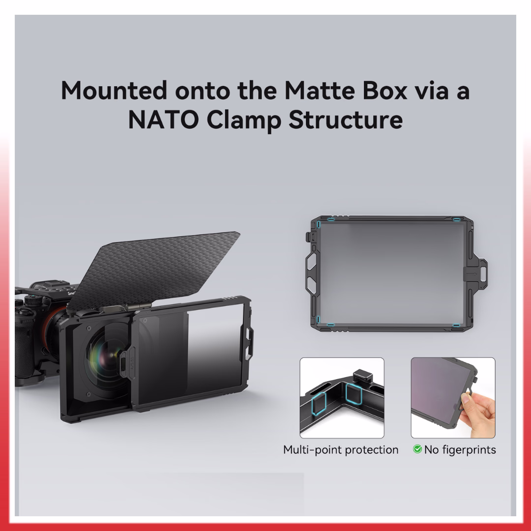 Built from durable materials, the matte box offers reliable performance for both professional and everyday use. Its solid structure ensures stable mounting on compatible camera rigs, while the streamlined design keeps the setup balanced and easy to handle. The matte box integrates smoothly with existing SmallRig accessories and camera cages, providing a cohesive and professional-looking setup.