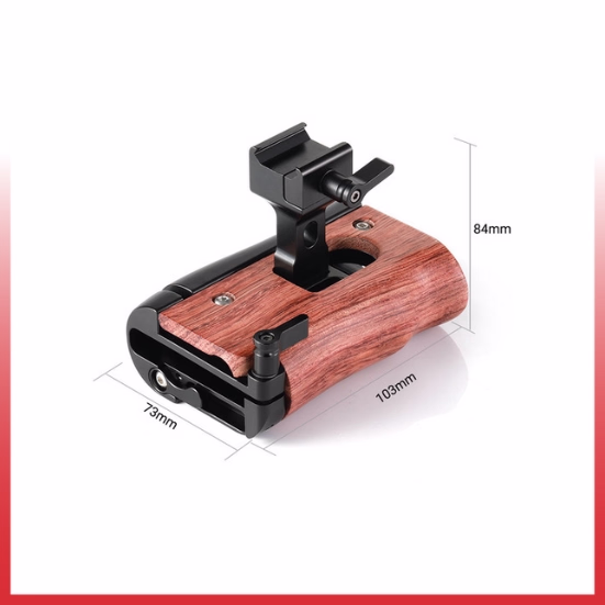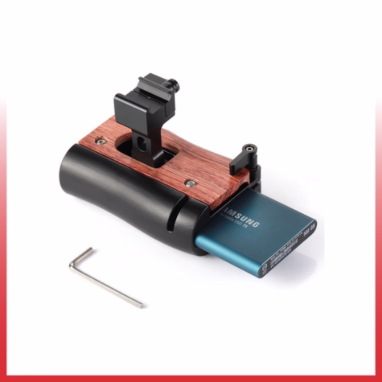 The SSD slides snugly inside the slot and is secured from sliding out with a locking switch on the bottom. The aluminum portion of the grip features multiple 1/4″-20 and 3/8″-16 mounting threads on top for adding accessories such as a monitor, light, or microphone. The wooden portion provides a secure, ergonomic grip.