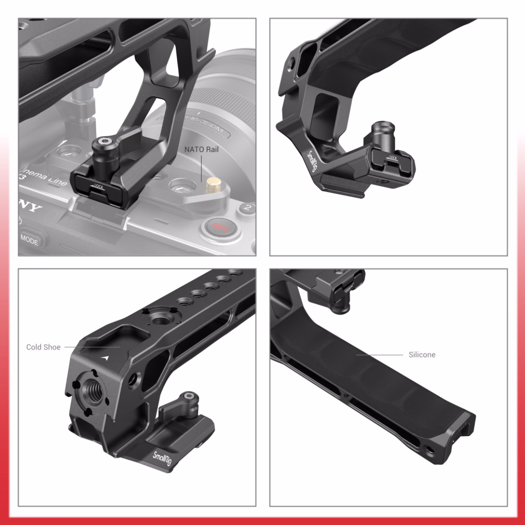 The SmallRig NATO Top Handle Lite 3766 includes multiple 1/4”-20 threaded mounting points, allowing easy attachment of accessories such as microphones, LED lights, or small monitors. Its compact and minimalist design makes it suitable for mirrorless and DSLR camera rigs.