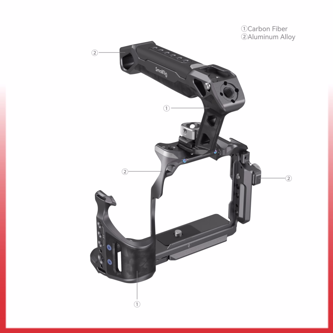 The SmallRig Rhinoceros Basic Cage Kit for Sony Alpha includes multiple 1/4″-20 and ARRI-style 3/8″-16 threaded mounting points, allowing seamless attachment of essential accessories such as microphones, external monitors, LED lights, and wireless transmitters. The integrated cold shoe mount further expands accessory compatibility without additional adapters.