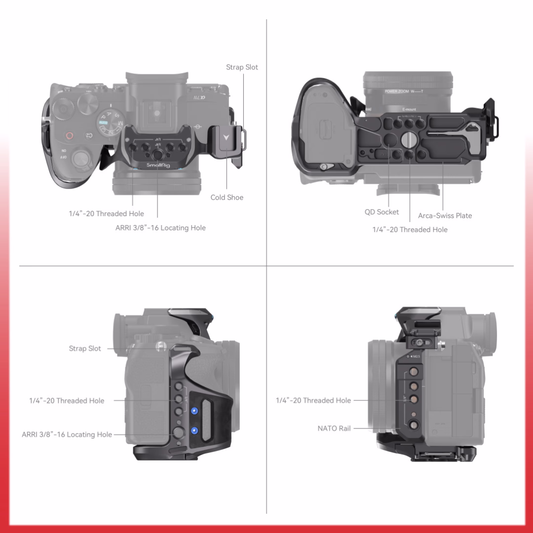 Equipped with multiple 1/4″-20 and 3/8″-16 threaded holes, ARRI locating holes, and cold shoe mounts, the SmallRig Rhinoceros Cage Kit for Sony Alpha supports a wide range of accessories such as top handles, side handles, microphones, LED lights, external monitors, and wireless transmission systems. The included handle enhances grip comfort and control, especially during extended handheld shooting sessions.