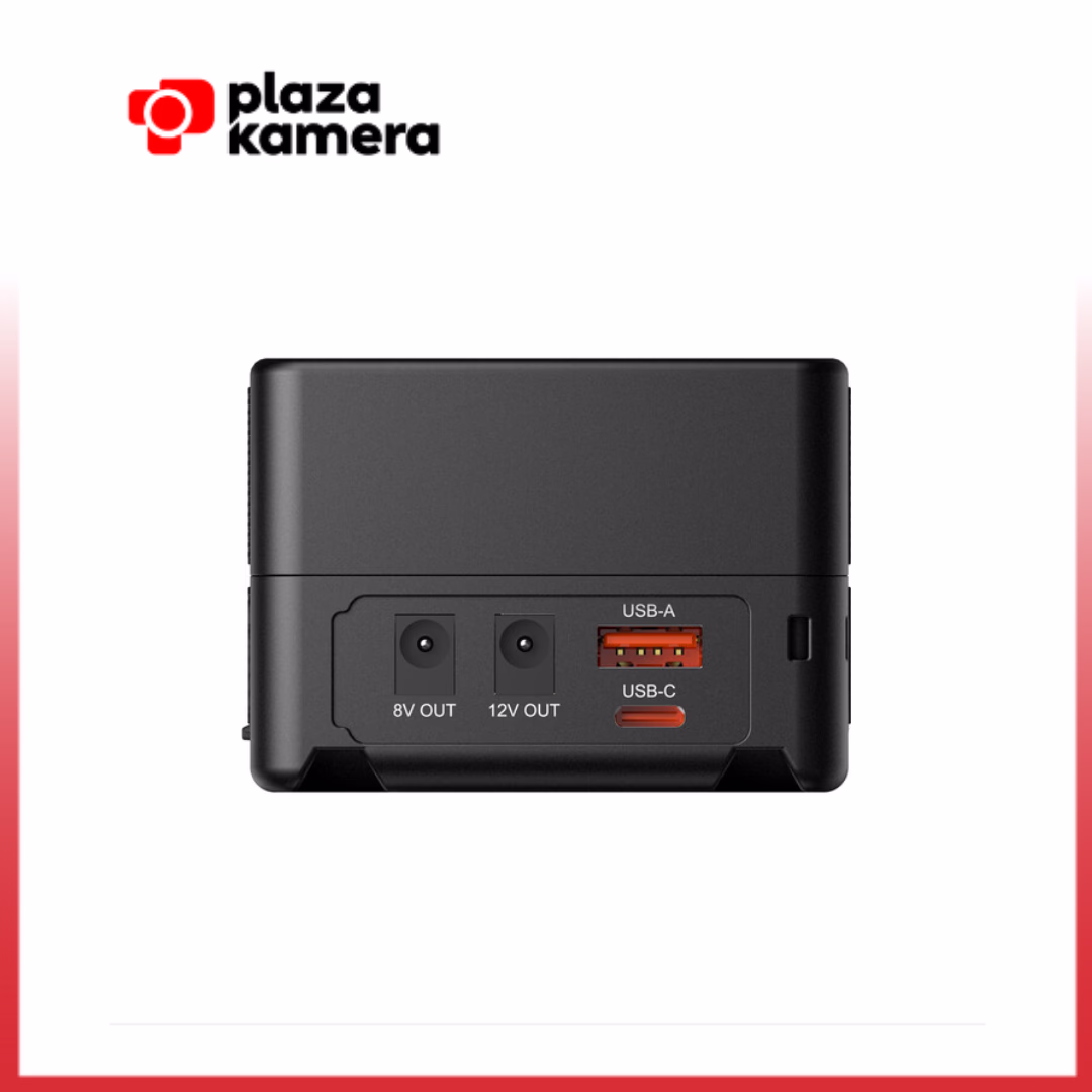 The battery can be charged using a standard V-mount charger, an optional D-Tap charger, or via the USB-C input/output with a 100W PD fast charger for a full charge in less than two hours. A built-in OLED display shows the remaining battery capacity and status.