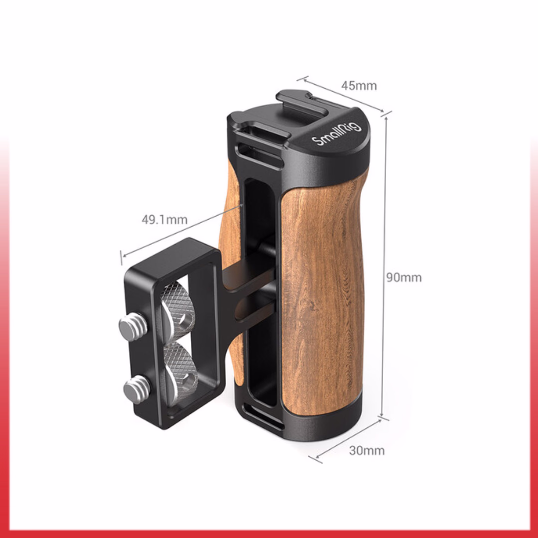 The SmallRig Wooden Mini Side Handle (ARRI-Style Mount) 2914 is designed for mirrorless, digital camera, and other small camera users. One ARRI 3/8“-16 screw with two locating pins are fixed to the side of the Cage. The flash and microphone can be mounted through the cold shoe, and the wrist strap, such as 2456, can be mounted through the eyelet hole to prevent the camera from accidentally falling off. Highly adjustable to fit different cage height and support the quick switch from left-handed to right-handed through the built-in wrench. Compatible with SmallRig Cages 2168. Made of aluminum alloy and rosewood with ergonomic design, the portable handle provides filmmakers with smooth and comfortable shooting experience.