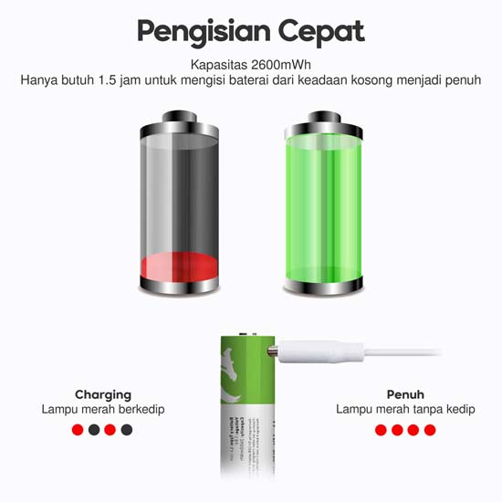 - Kapasitas Baterai: 2600mWh/ 1730mAh 1.5V