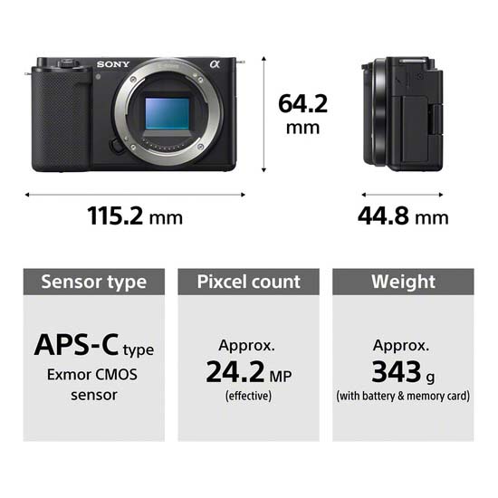 Dalam hal spesifikasi, ZV-E10 memiliki sensor 24.2MP APS-C Exmor CMOS, yang memungkinkan perekaman video UHD 4K hingga 30p, perekaman Full HD pada 120p, dan pengambilan gambar hingga 11 fps. Sensitivitas berkisar antara 100-32000 untuk bekerja dalam berbagai kondisi pencahayaan dan desain sensor juga mengintegrasikan sistem Fast Hybrid AF 425 titik untuk pelacakan dan deteksi subjek yang akurat.
