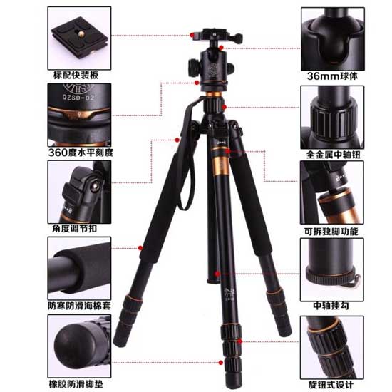 Tripod Beike Q999 adalah tripod kamera dslr yang bagus dan cukup murah, tripod ini cocok digunakan untuk segala merk kamera seperti canon nikon sony olympus dan lainya. Dengan desain dan build quality yang sangat baik menjadikan tripod ini kokoh kuat dan stabil saat digunakan dalam pengambilan foto. Tripod kamera ini berbahan alumunium alloy yang kuat namun tetap ringan sehingga memudahkan jika dibawa bepergian. Panjang saat dilipat 43cm sehingga bisa masuk kedalam tas Anda. Kaki tripod ini juga bisa dijadikan monopod dengan cara melepas salah satu kaki dan ballhead tripod Beike Q999 ini. Dengan berbabagai kelebihan diatas tidak salah jika tripod ini dijuluki sebagai tripod travell yang multifungsi. Berikut ini beberapa fitur lengkap dari tripod kamera dslr beike Q999.