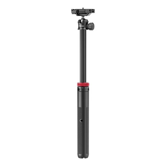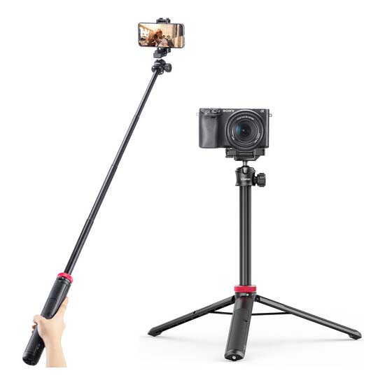 Ulanzi MT-44 Mini Extension Tripod Black dapat digunakan sebagai mini tripod atau tongkat selfie untuk kamera compact dan smartphone. Ini menyesuaikan dari 12,7″ yang diciutkan menjadi 43″ di empat bagian. Pegangan bawah terbuka untuk berfungsi sebagai alas tripod. Dudukan kamera di atas mengubah antara platform kamera dengan sekrup pemasangan standar 1/4″-20 ke dudukan smartphone yang dapat disesuaikan. Dudukan kamera berada di atas ball head, yang menawarkan rotasi 360° serta penyesuaian kemiringan 90°, yang akan memungkinkan Anda mengatur kamera atau ponsel dalam mode lanskap atau potret.