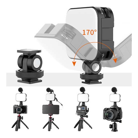 Perlengkapan itu sendiri menampilkan empat cold shoe, satu di setiap sisi. Dudukan sepatu yang dapat dimiringkan yang disertakan memungkinkan pemasangan cahaya pada kamera Anda dan menyesuaikan sudut cahaya. Mount perakitan yang disertakan (konektor perlengkapan) memungkinkan menumpuk dua unit VL-100C bersama-sama secara horizontal atau vertikal.